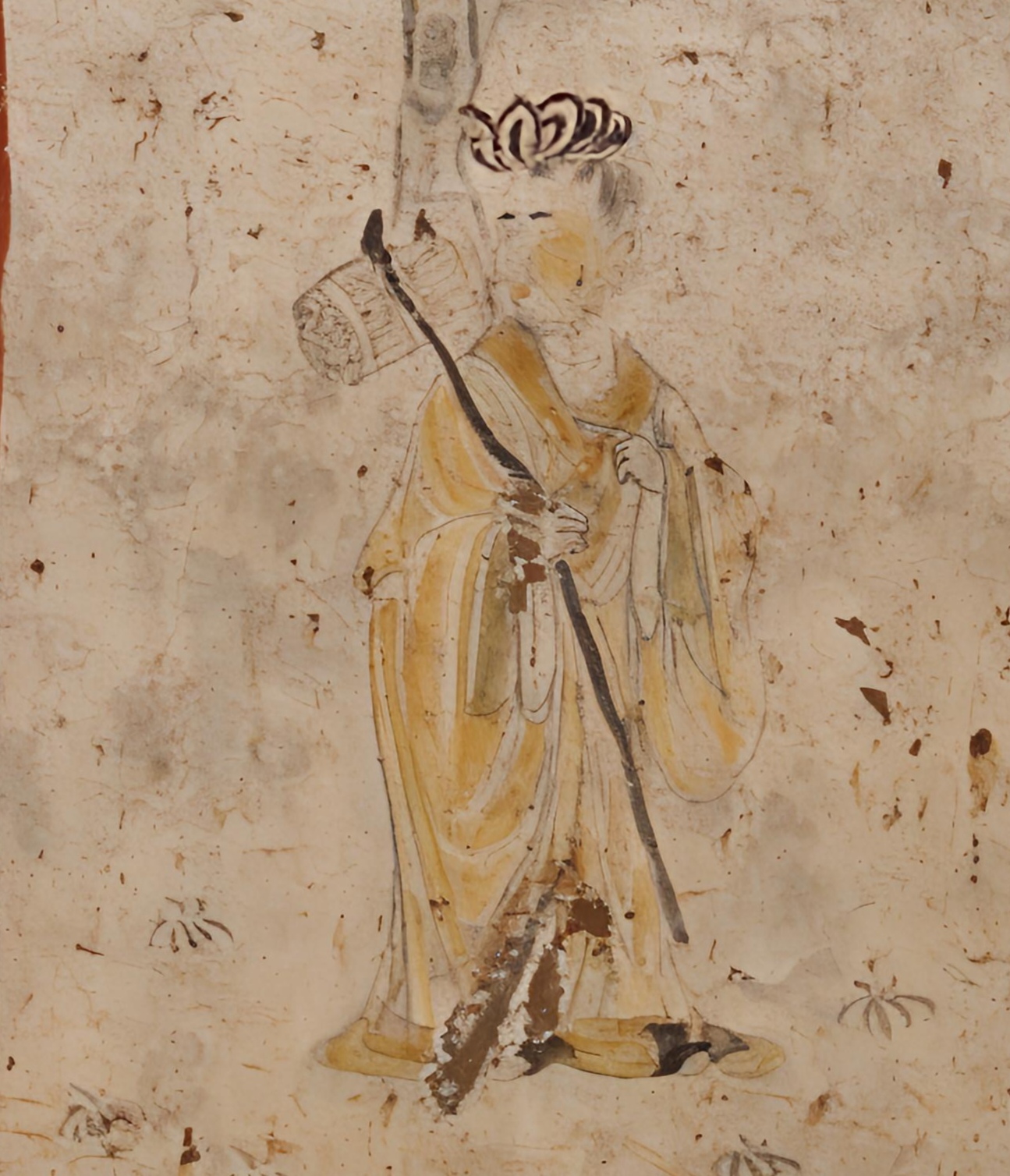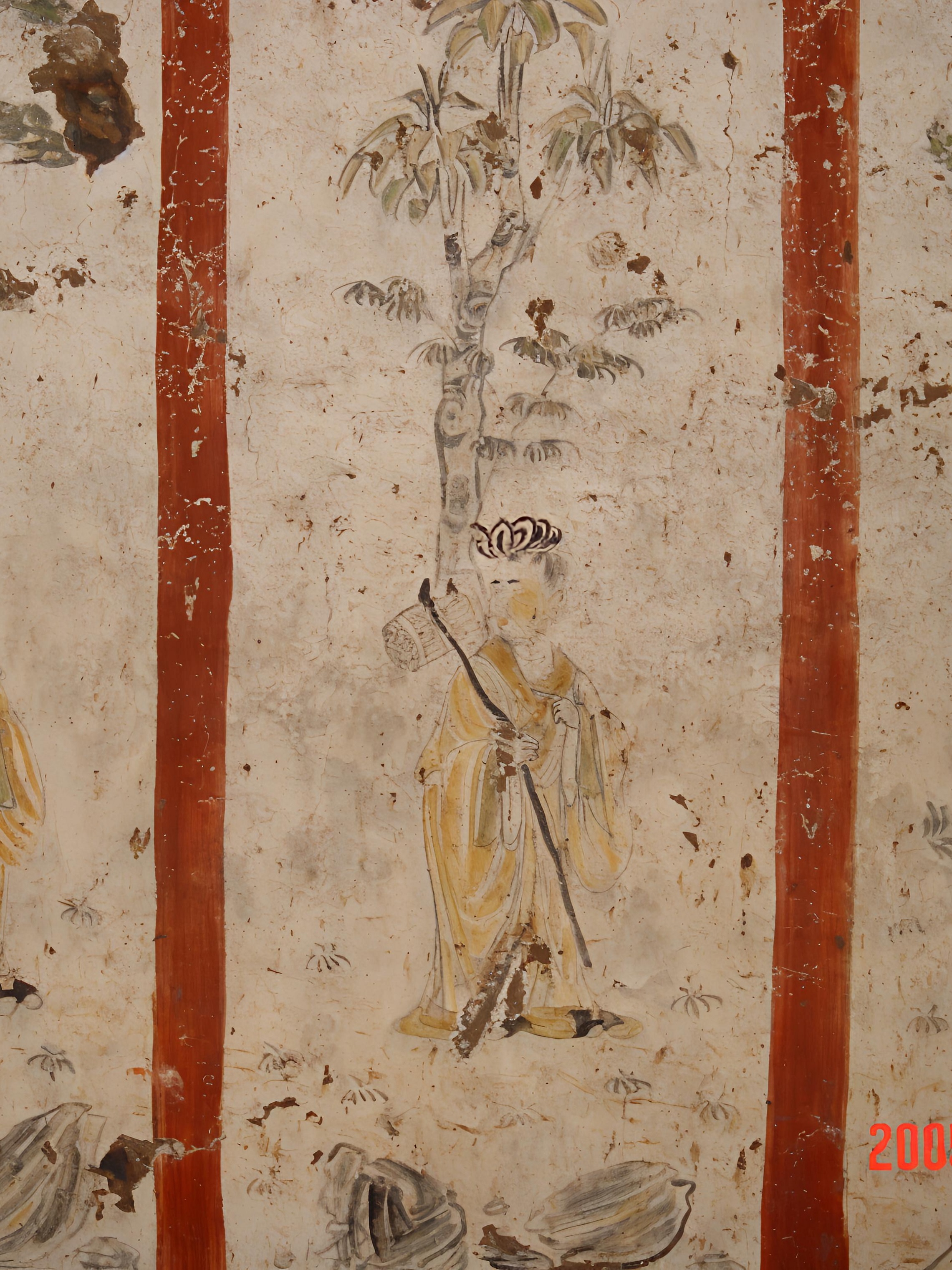 It has some areas of loss at the lower hem of the figure's clothing in the mural.