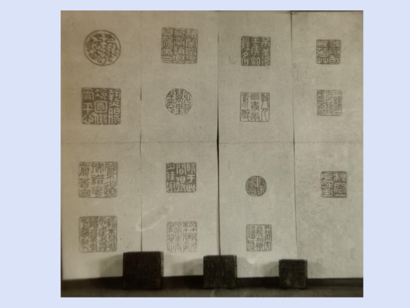 The largest seal is inscribed with: "热肠冷面傲骨平心", "莺边按谱,花前觅句", "读未见书如逢良友,读已见书如遇故人", "梅阁留春,荷亭消夏". The middle seal bears: "身行万里半天下", "时于此间得少佳趣", "松竹风姿鹤性情", "不羡王侯知姓名", and "教人长寿花前醉".The smallest seal features: "燕交飞处柳烟低", "我欲醉眠芳草", "小楼一夜听风雨", "秋容一片如画".