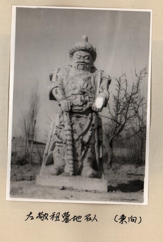 左敬祖墓位于河间市大渔庄村东。墓封土高3米,底径6米。墓前有康熙十二年(1673年)御祭碑,神道两侧由南向北依次对称排列:石虎、石狮、石羊、石马、石翁仲,其中石武士身材魁梧,手执兵器,头戴战盔,身着虎头铠甲,一手握拳,一手按十一节鞭,为汉白玉质地,雕刻精细,造型生动逼真,有较高艺术价值。
