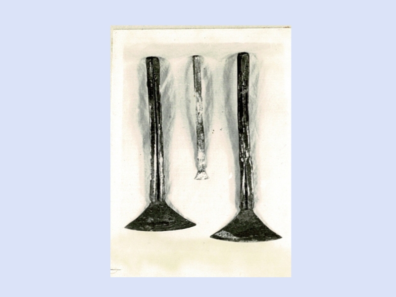 单块铜片截成钺形,按木把,把未经削整,粗糙,并沾满蜡。大小三把,大的两把,小的一把。大的粗壮,比苗族的简陋。用途和苗族相同。照片左起第一件长21cm,刀宽8.7cm;第二件长14.9cm,刀宽 1.8cm;第三件长23cm,刀宽 8.7cm。